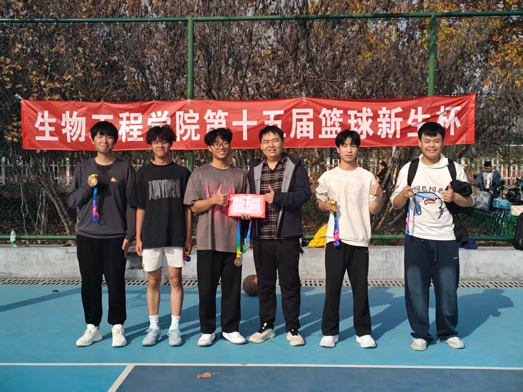 11月11日决赛当天,25级辅导员王珂前往现场观赛。赛场上,球员们精神饱满,认真专注,比赛现场气氛紧张激烈,精彩瞬间层出不穷。随着哨声响起,队员们配合默契,带球突破、精准传球、起跳投篮等动作行云流水;防守时紧盯对手,卡位、抢断毫不松懈,每一次得分都引来观众欢呼呐喊。经过40分钟的激烈对抗,最终饲料2504班摘得冠军,生技2501班获得亚军,制药2501班斩获季军。
