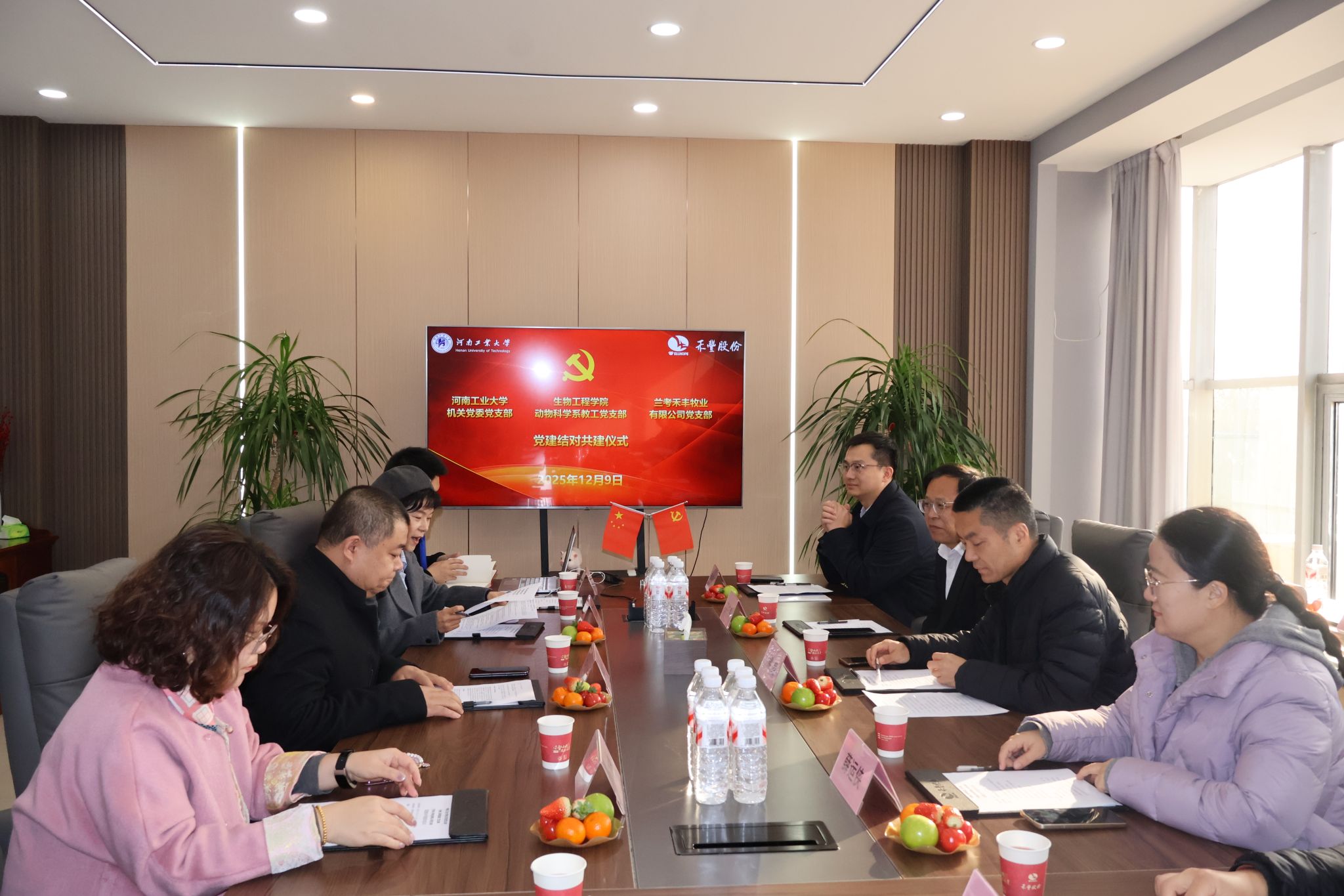 动物科学系教工党支部与兰考禾丰牧业有限公司党支部共同举办党建结对共建签约仪式。兰考禾丰牧业有限公司总经理、华中区运营采购总监王志文,华中区技术总监孙亚楠、副总经理崔艳艳、党支部书记底文龙,以及三方党支部党员代表参加仪式。仪式由崔艳艳主持。